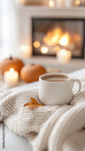 Warm coffee mug on knitted plaid with autumn leaves, pumpkins and candles near burning fireplace