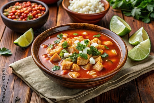 Warm, comforting menudo soup simmers tripe, hominy, and a rich broth, accompanied by crunchy onions, fresh cilantro, and a squeeze of lime.