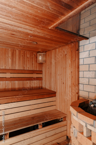 Warm cozy sauna interior with wooden walls, ceiling and floor, featuring a stove with hot stones in the corner. Soft and dim lighting creates a relaxing and intimate atmosphere.