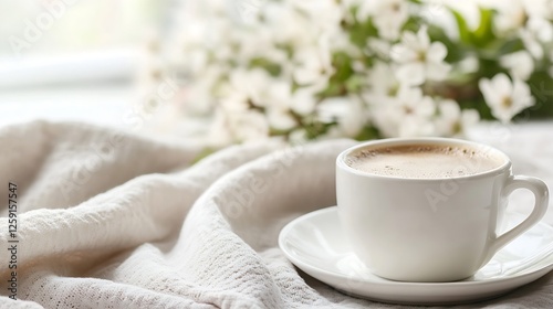 Warm cup of coffee on cozy fabric with fresh flowers for a relaxing morning moment : Generative AI