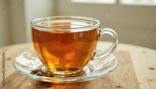 Warm cup of tea on rustic wooden table, a cozy beverage moment soothing