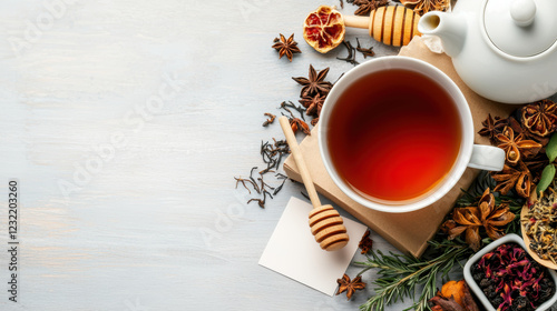 warm cup of tea surrounded by spices, honey, and dried fruits creates cozy atmosphere perfect for relaxation