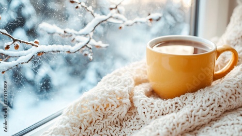 Warm drink in yellow mug on cozy knitted blanket by snowy window.