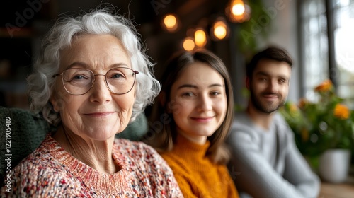 Warm family gathering with cheerful grandmother, mother, and son enjoying time together at home