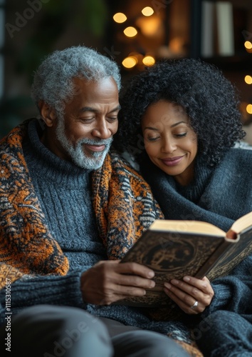 Warm Holiday Traditions Senior Couple Reading Together in Cozy Living Room