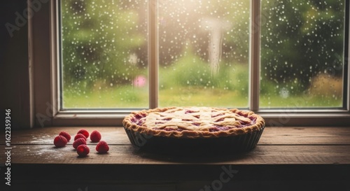 Warm homemade apple pie with fresh raspberries sits on a rustic wooden windowsill on a rainy day