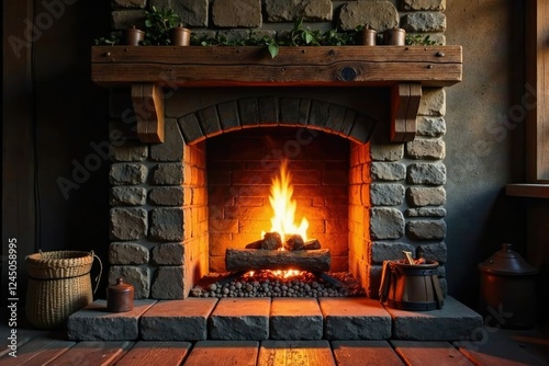 Warm light emanates from a crackling fireplace, rustic decor, warm ambiance