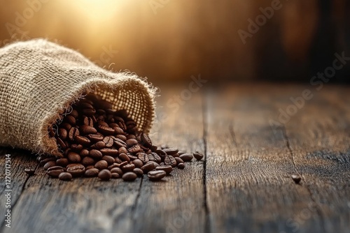 Warm light enhances coffee beans spilling from a burlap sack on a rustic wooden table, creating a cozy farmhouse atmosphere