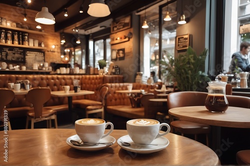 Warm light fills a stylish cafe interior with wooden tables and chairs