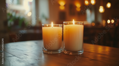 Warm light from two candles creating a cozy atmosphere in a dimly lit cafe during the evening hours. Generative AI
