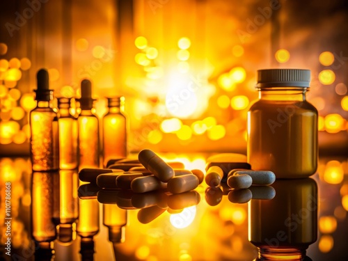 Warm Light Silhouette of Oral Medication: Captivating Background with Pill Bottles, Capsules, and Tablets for Health and Wellness Themes in Soft Golden Hues