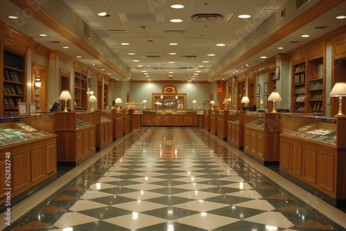 Warm lights illuminate an empty library with wooden shelves and a checkered floor, inviting a peaceful read