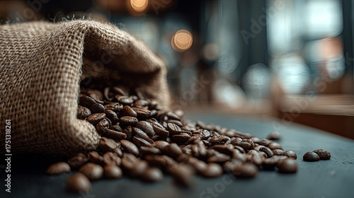Warm macro shot of freshly roasted coffee beans emerging from rustic jute bag, showing detail and steam