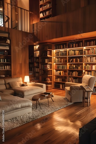 Warm minimalist library with neatly arranged bookshelves AI generated illustration