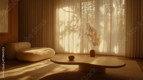 Warm, minimalist living room bathed in golden sunlight. Soft, neutral tones, flowing drapes, and organic shapes create a serene atmosphere