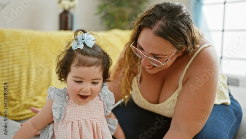 Warm mother-daughter duo smiling and exuding confidence in their lovely home, joyfully huddled on the living room sofa - a delightful expression of casual, positive family lifestyle indoors.
