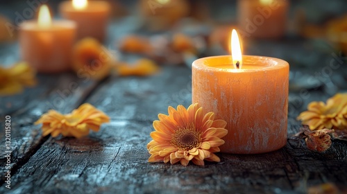 Warm Orange Candle with Flowers on Rustic Wooden Surface at Night