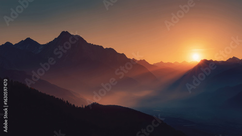 Warm orange sunset glow over mountain silhouettes