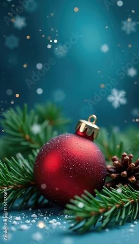 Warm red ball nestled among lush greenery on a blue winter backdrop, holiday, decorations, pine cone