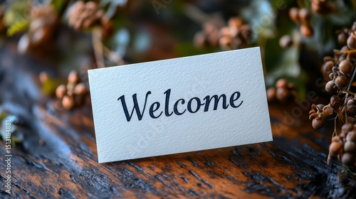 Warm Rustic Greetings: Welcome Message on Textured Paper Amidst Autumnal Foliage and Aged Wood Backdrop