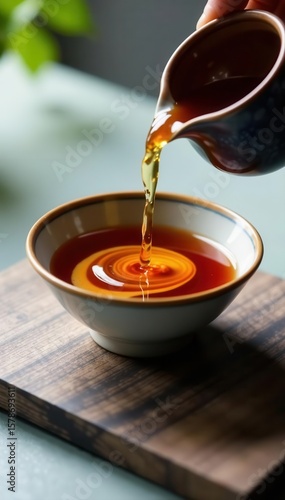 Warm sake poured into small ceramic bowl, swirling liquid, tradition, porcelain, wood