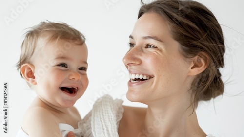 Warm smiles shared between a mother and her happy baby, capturing their strong bond in a light studio.