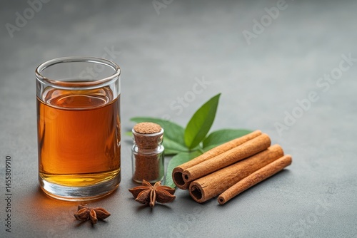 Warm spiced beverage with cinnamon, star anise, and green leaves on a neutral background