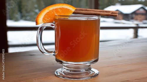 Warm spiced drink with orange and cinnamon cozy cabin setting beverage photography winter wonderland
