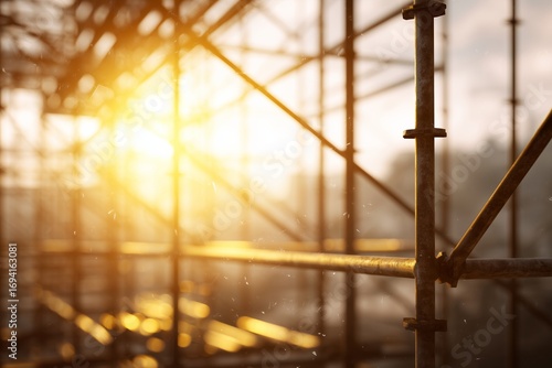 Warm sunlight filters through construction scaffolding at a building site during the early morning, casting long shadows on the ground