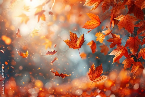 Warm sunlight filters through floating autumn leaves, creating a magical and dreamy forest atmosphere