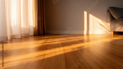 Warm sunlight streams through curtains, casting shadows on wooden floor in a cozy living room setting