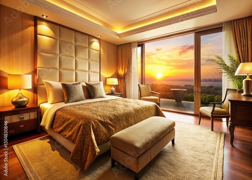 Warm Sunset Glow Illuminates Cozy Hotel Bedroom Interior