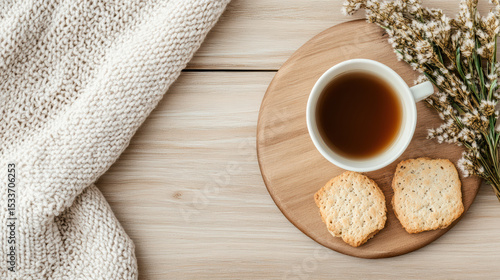 Warm tea and biscuits on wooden tray with cozy knit and dried flowers