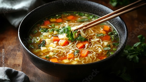 Warm Vegetable Noodle Soup in a Black Bowl