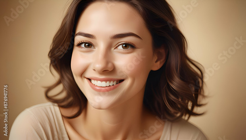 Warm Vintage Elegance: Close-Up Portrait of a Smiling Young Brunette Woman in Sepia Tone, Set Against a Soft Sandy Background - Perfect for Advertising and Professional Photography