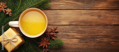 Warm winter tea with spices in a mug beside a beautifully wrapped gift on a rustic wooden table decorated with pine branches