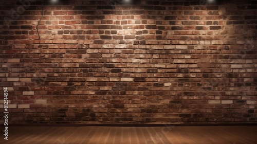 Warmly illuminated empty stage with a textured brick wall background and spotlights
