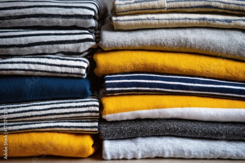 Warmly stacked colorful sweaters. Clothing rack. Colorful winter season knitwear stacking in a closet. Autumn clothes. Cozy display. Stack of folded wear showcasing warmth and style for fall season.
