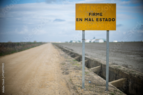 Warning sign along dirt road in rice fields of Isla Mayor, Seville
