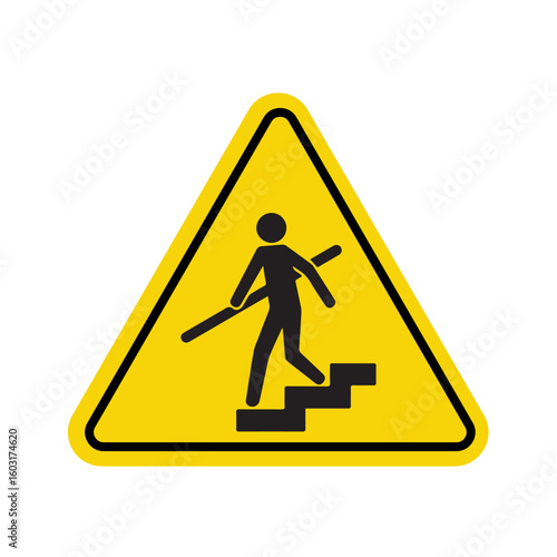 warning sign with black silhouette of person carrying pole on stairs in yellow triangle