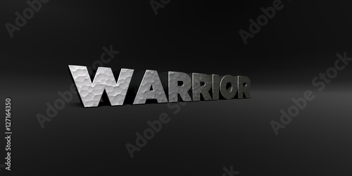 WARRIOR - hammered metal finish text on black studio - 3D rendered royalty free stock photo. This image can be used for an online website banner ad or a print postcard.