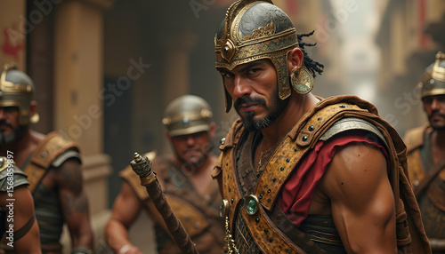 Warrior in Detailed Armor Holding Spear with Fellow Soldiers