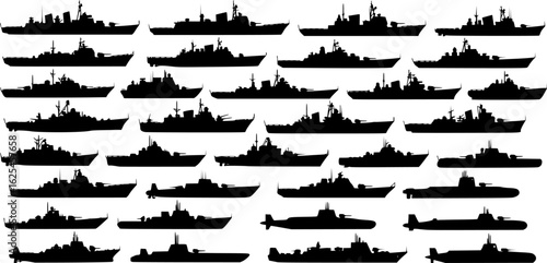 Warship navy silhouettes set, large pack of vector silhouette design, isolated white background.