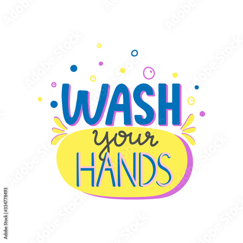Wash your hands lettering. Unique hand written quote. Stay home concept. Wash your hands with soap. Healthy rules poster. Virus protection composition. Vector illustration