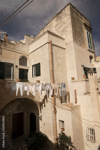 Washing clothes drying in sunlight with house, Puglia, Italy