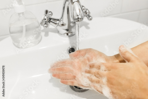 Washing hands. Rubbing palms, washing hands with antibacterial soap and in proper technique on background of flowing water in white bathroom. Prevention coronavirus. Cleaning and disinfecting hands