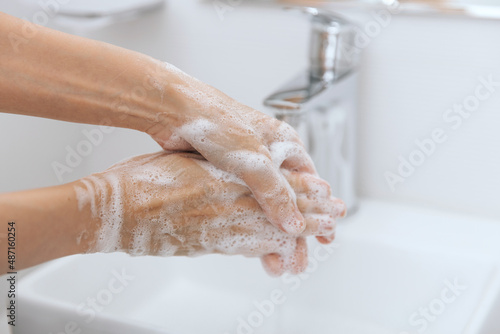 Washing hands under the flowing water tap. Washing hands rubbing with soap for corona virus prevention, hygiene to stop spreading corona virus in or public wash room. Hygiene concept hand detail