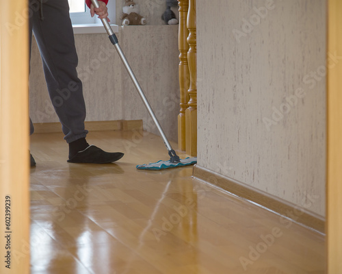 Washing the parquet floor with a mop in the maid 's apartment . The concept of routine household chores