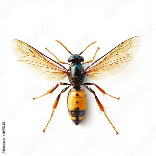 Wasp in flight, wings visible, isolated on white background, full body long shot