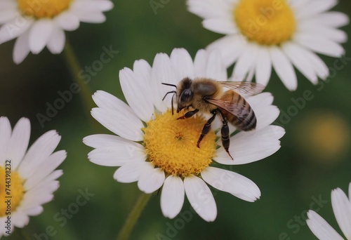 Wasp on a flower. Macro photo. Wasp close-up. Chamomile. White petals texture. Yellow pistil and stamens. Drawing on the body of a wasp. The wasp pollinates the flower. Background - chamomile.
